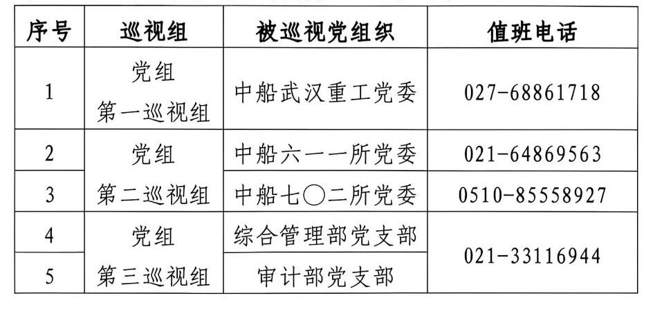 按照中国船舶集团有限公司党组对巡视工作统一部署,近日,2026年度第一批次巡视组完成全面进驻。此批巡视分3个巡视组,分别对中船武汉重工党委、中船六一一所党委、中船七〇二所党委等党组织开展常规巡视,对总部综合管理部党支部、审计部党支部开展“四型”总部建设专项巡视。